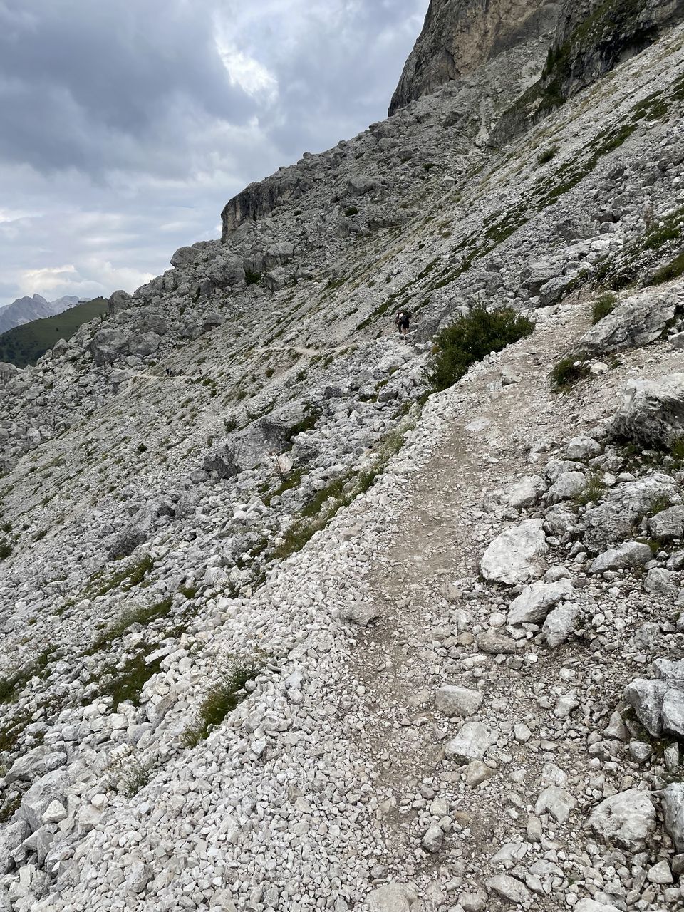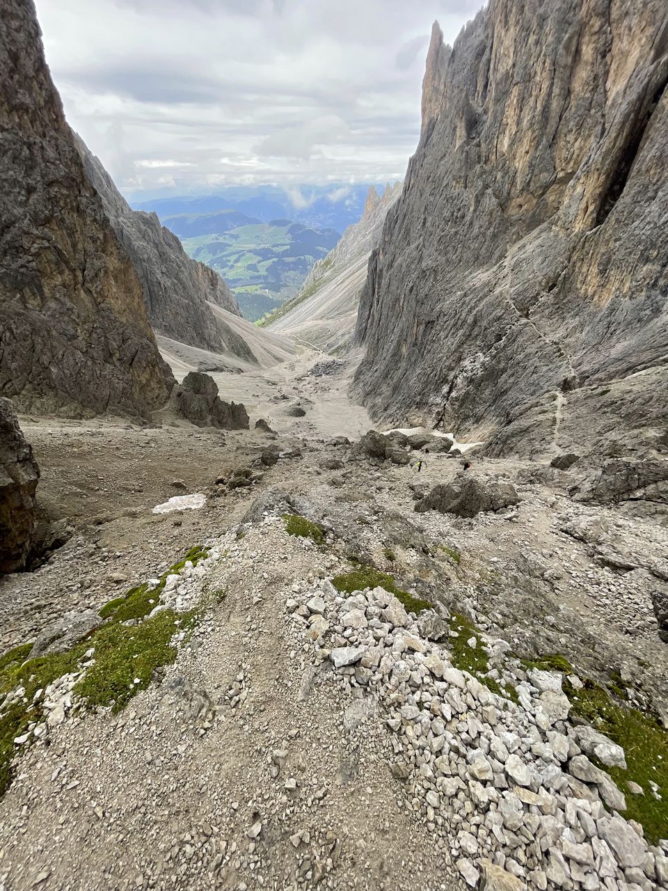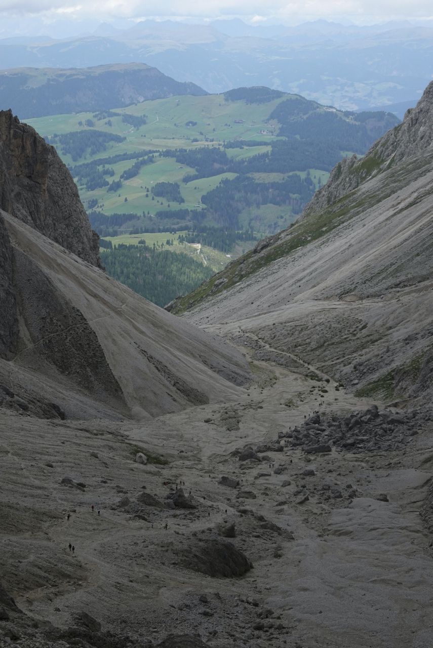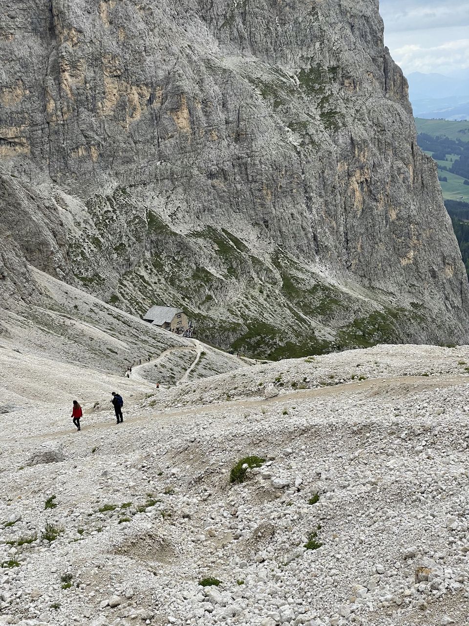 Dalla forcella si scende sul versante opposto lungo il sentiero 526, con tratti ripidi e ghiaiosi che richiedono passo sicuro, fino al Rifugio Vicenza (2253 m), posto in una conca selvaggia ai piedi delle pareti settentrionali del gruppo. Si prosegue quindi in traversata lungo il sentiero 526A, che in leggera discesa conduce al Rifugio Emilio Comici (2153 m), situato in posizione panoramica sul versante settentrionale del Sassolungo.