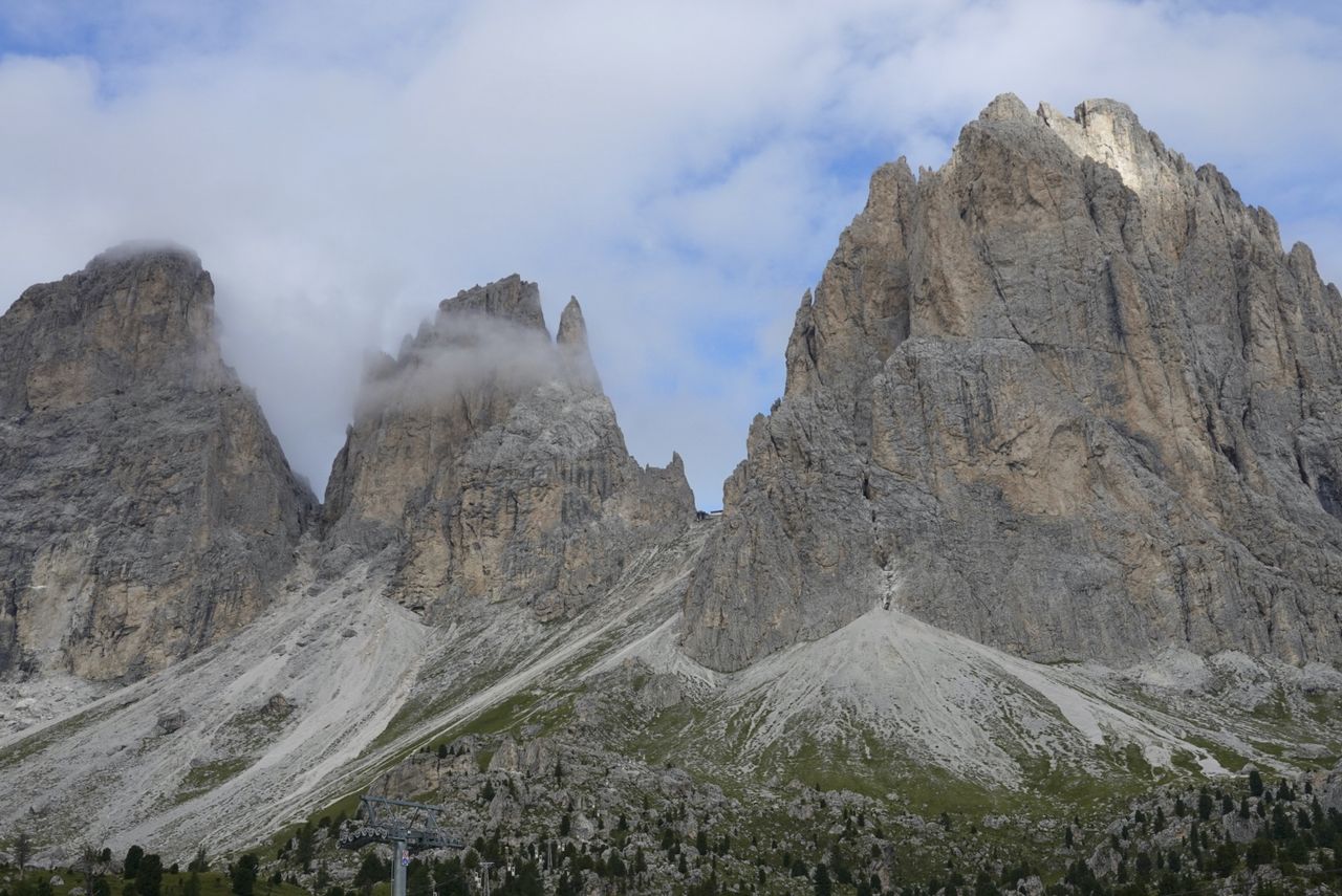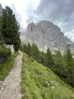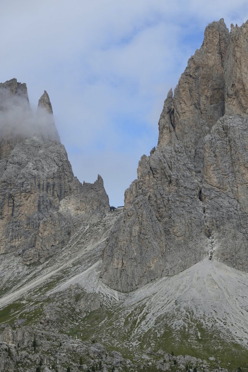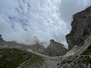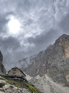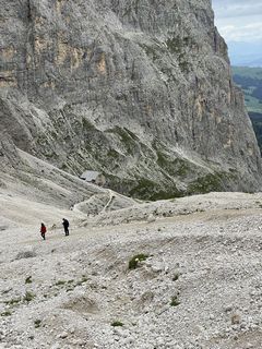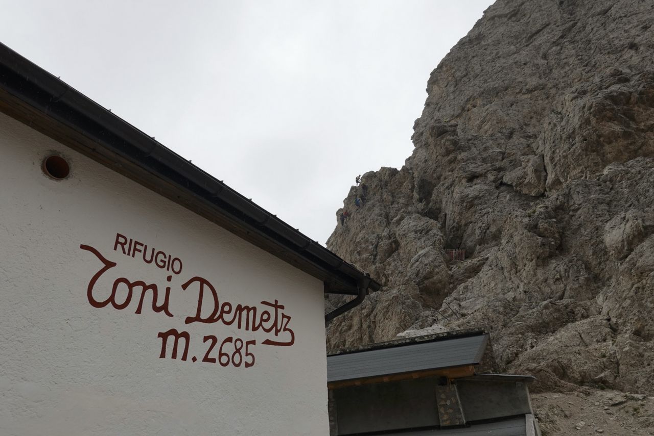 Dal Passo Sella (2240 m) si imbocca il sentiero CAI 525, che sale deciso tra ghiaioni e roccette verso la Forcella del Sassolungo. La salita, pur breve, è impegnativa per la pendenza e il fondo instabile, ma regala splendide vedute sul gruppo del Sella e sul Sassopiatto. Raggiunta la forcella si trova il Rifugio Toni Demetz (2685 m), incastonato tra le pareti del Sassolungo e della Torre Innerkofler.