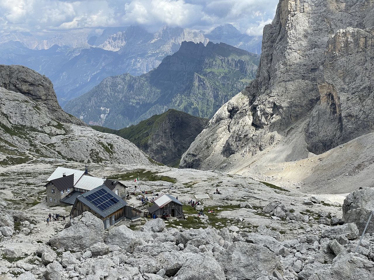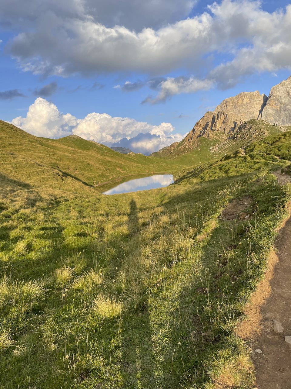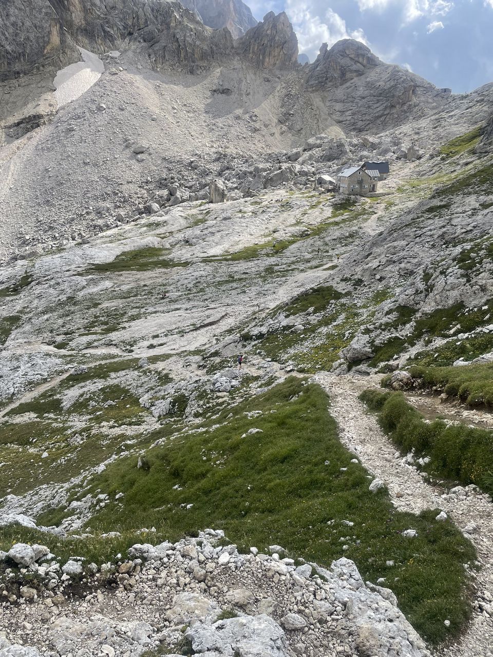 Per il rientro si compie un anello escursionistico: dal rifugio si segue il sentiero 703, che traversa in quota verso ovest toccando il Passo del Fochet del Focobon (circa 2300 m) e poi il Passo Venegiota. Da qui si prosegue verso il piccolo e suggestivo Laghetto di Caladora, incastonato tra pascoli e rocce dolomitiche, e si continua fino alla Forcella Venegia. La discesa finale, su traccia ben segnata, conduce alle spalle della Malga Venegia, da cui in breve si rientra al parcheggio di partenza.